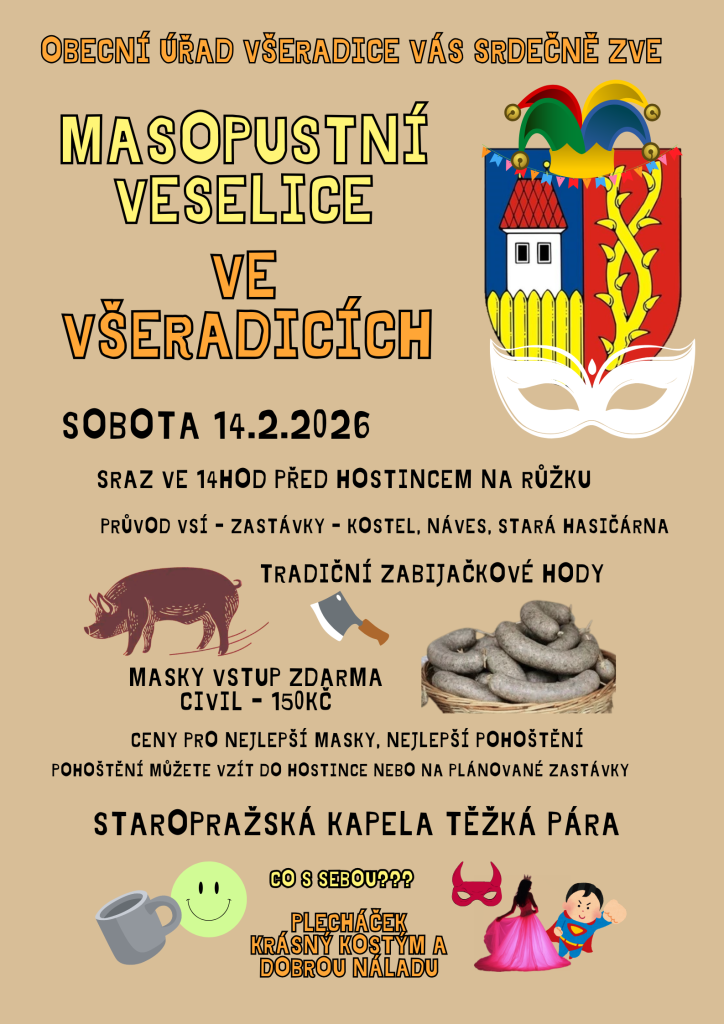 Obecní úřad Všeradice vás srdečně zve na tradiční Masopustní veselici, která se uskuteční v sobotu 14. února 2026. Přijďte si užít odpoledne plné masek, hudby a dobrého jídla!