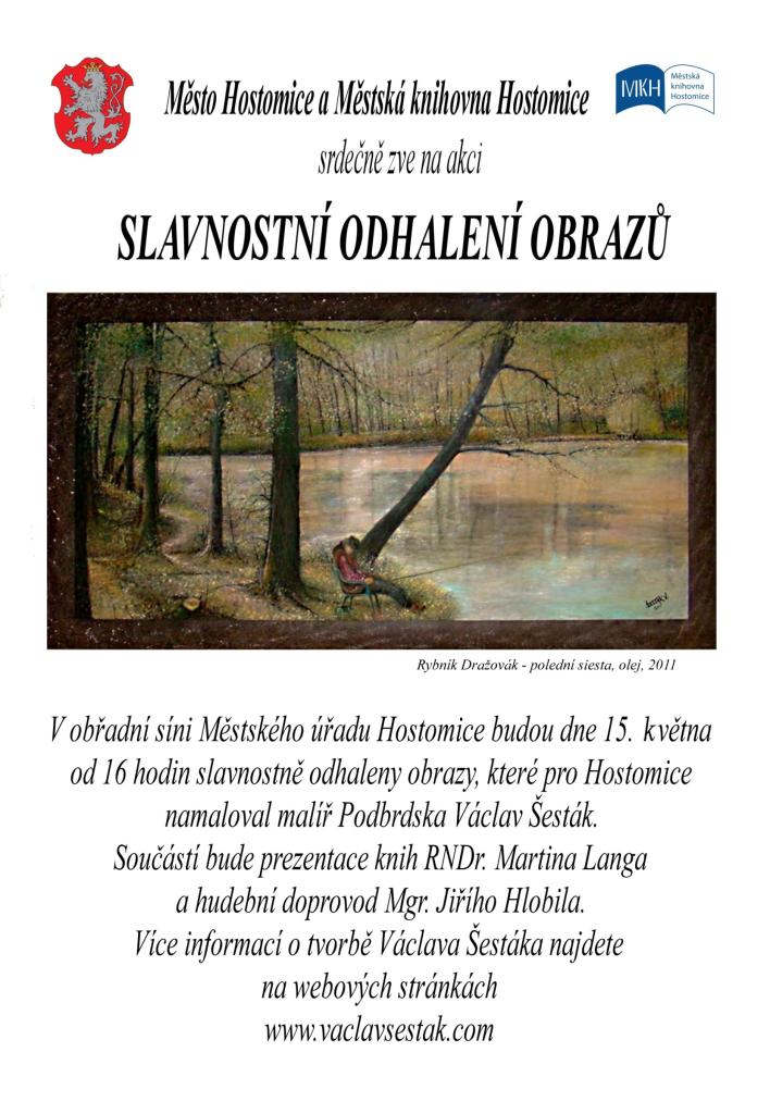 Ve čtvrtek 15. května od 16 hodin budou v obřadní síni Městského úřadu Hostomice slavnostně odhaleny obrazy, které pro Hostomice zhotovil malíř Podbrdska Václav Šesták. Součástí bude prezentace knih Dr. Martina Langa a hudební doprovod Mgr. Jiřího Hlobila. Václav Šesták zde představí i svou další výtvarnou tvorbu. Připraveno bude drobné občerstvení. Srdečně zve město Hostomice a Městská knihovna Hostomice.
