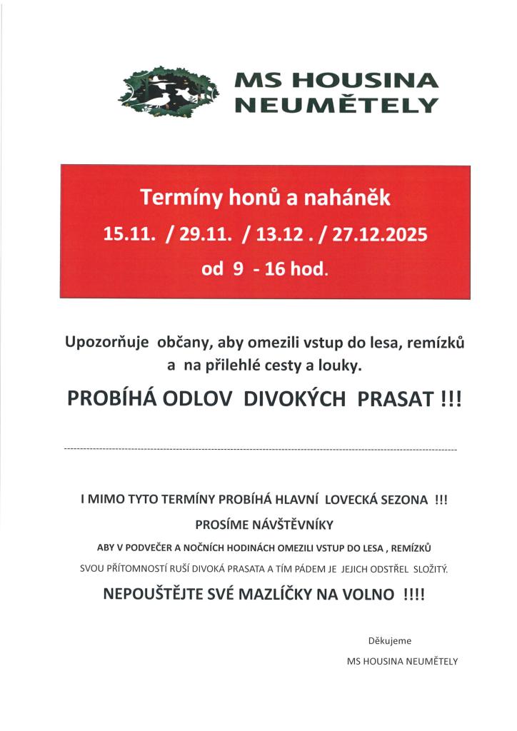 Myslivecké sdružení HOUSINA NEUMĚTELY upozorňuje na probíhající